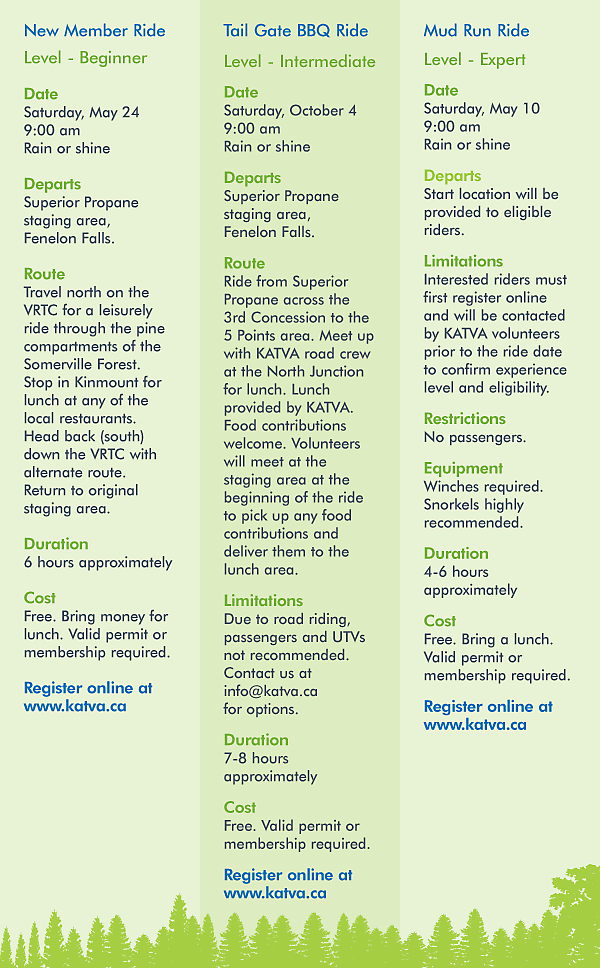 We plan rides for members, guests, and visitors that appeal to beginner, intermediate, and expert rider skill-sets. If you are new to KATVA and have not participated in one of our organized rides, we invite you to join in the challenges and fun. If you are not a member of KATVA or live outside our ride area, but want to participate, we welcome you. All riders, club members or not, must pre-register for organized rides. Additionally, you are responsible for ensuring that you have a valid KATVA or HATVA membership or permit, which can be purchased on ride day.